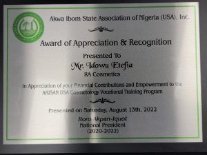 On Tuesday, September 13, 2022, the National President of the Akwa Ibom State Association of Nigeria (USA), Inc. (AKISAN USA), Mr. Itoro Akpan-Iquot presented an Award of Appreciation and Recognition to the CEO of RA Cosmetics, Mr. Idowu Etefia. The award, in appreciation of his financial contributions and empowerment to the AKISAN USA Cosmetology Vocational Training Program, was given to him at his office in Norcross, Georgia.